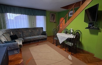 Lakóterülete összesen 148 m2, a földszinten előtér, konyha, kamra, étkező, nappali, 1 szoba, fürdőszoba és WC található, a tetőtérben 2 szoba, nappali (de 1 válaszafallal szoba alakítható ki, eredeti terv is az volt), valamint fürdő és WC lett kialakítva.